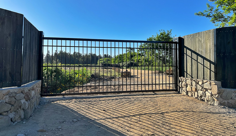 Acceso con muro de piedra y madera, portón eléctrico y área común designada para la disposición de residuos provenientes de las parcelas.